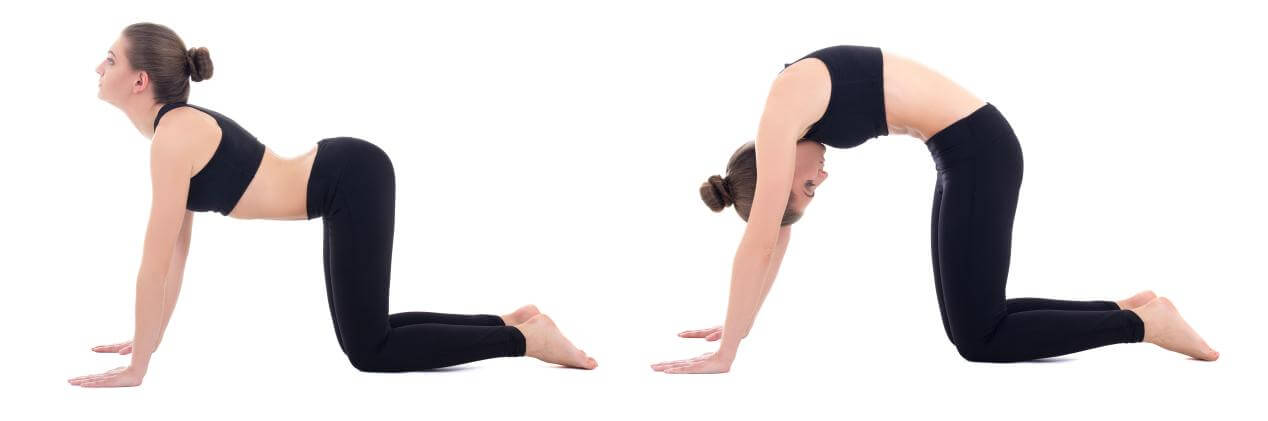 C.As you exhale, tuck your belly, lift your side waist, circle your spine, and release your head toward the floor into cat pose. Actively press the floor and feel the stretch in your back.